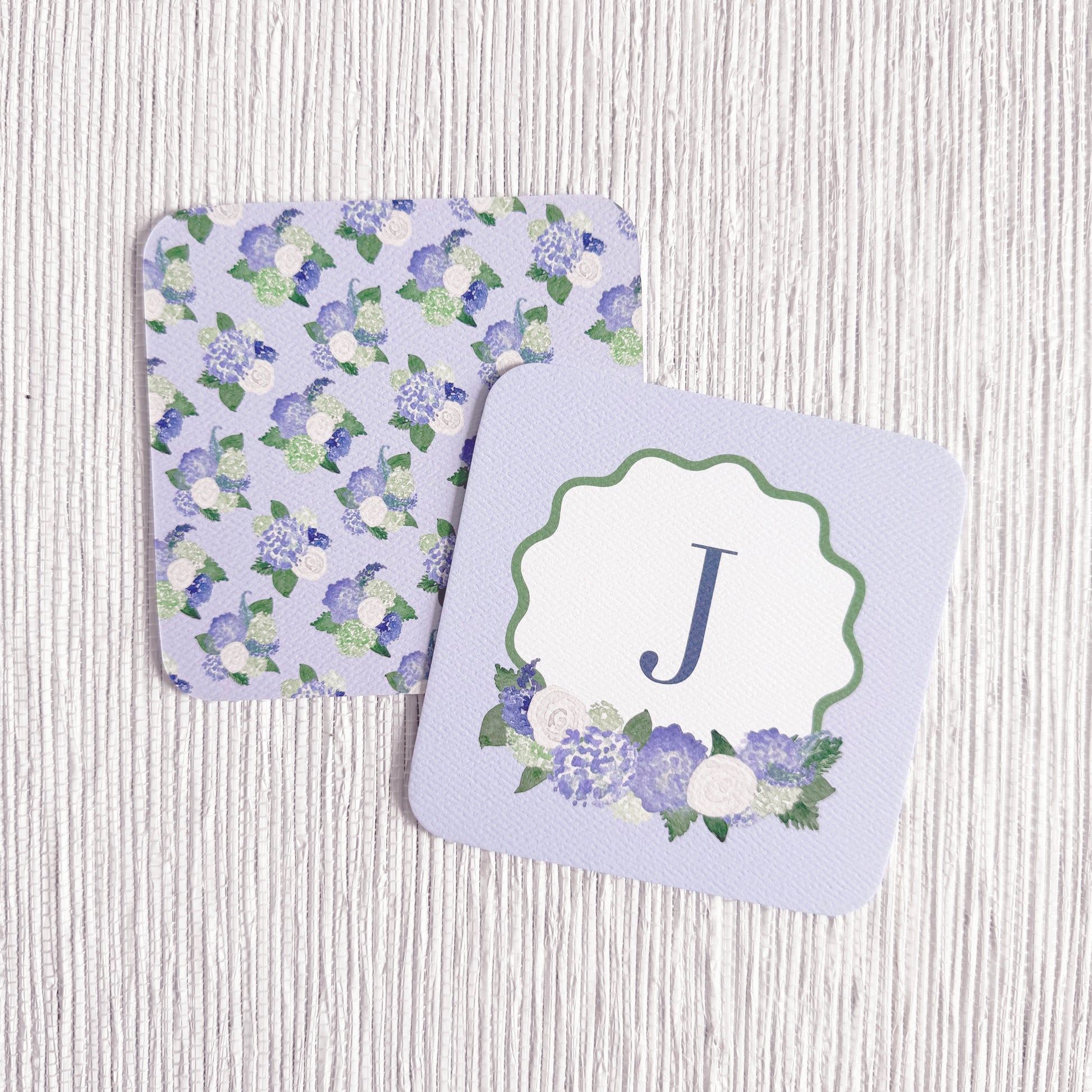 A set of one notepad and 12 coasters with a single initial and hydrangea watercolor design in a cello bag with a ribbon - ready for gifting! The notepad and one side of the coasters have an initial and hydrangea design and a hydrangea pattern on the back of the coasters!