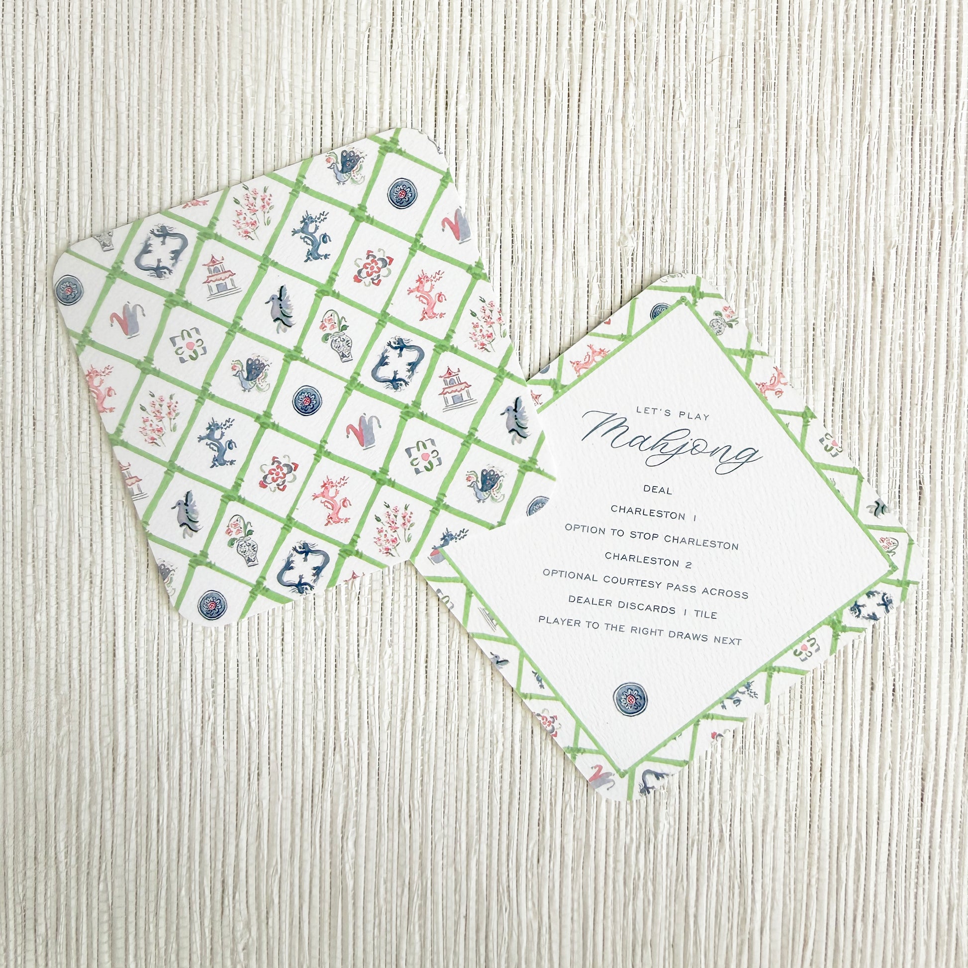 The perfect mahjong gathering hostess gifts! A set of 8 paper coasters with our mahjong bamboo pattern on one side and mahjong tips on the other.