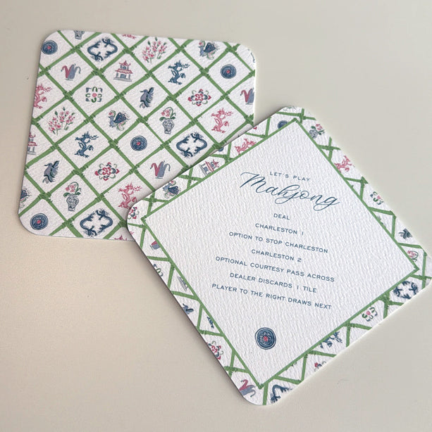 The perfect mahjong gathering hostess gifts! A set of 8 coasters with our mahjong bamboo pattern on one side and mahjong tips on the other.